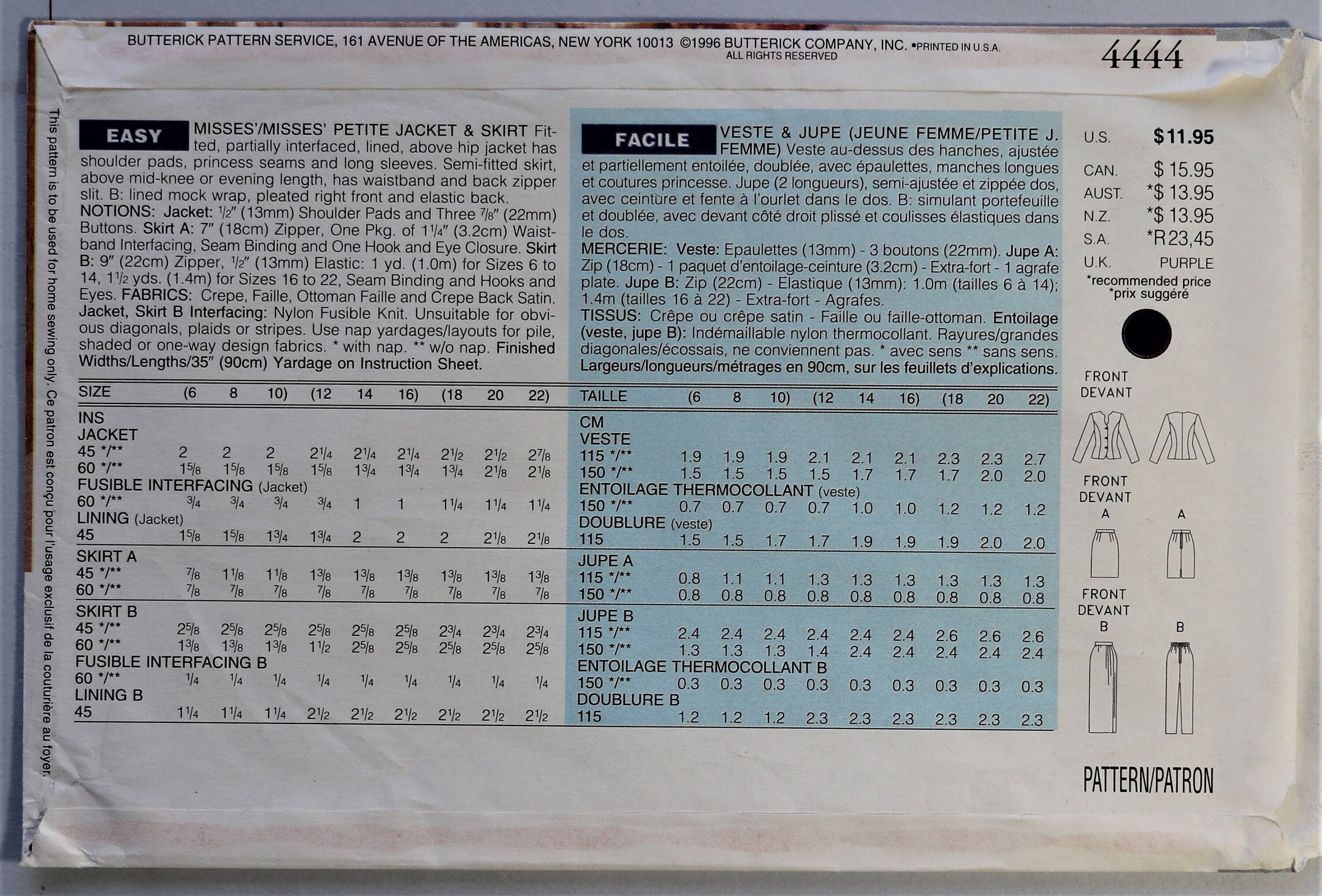 Amazon Com Butterick 4444 Misses Miss Petite Formal Jacket Skirt Size 18 20 22 Sewing Pattern Arts Crafts Sewing